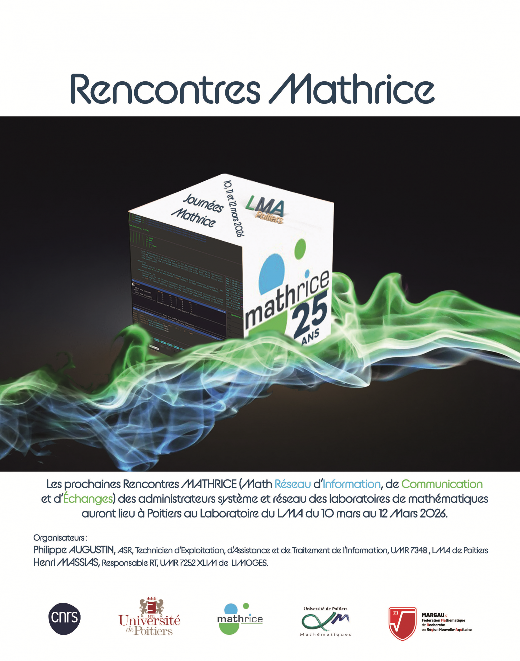 Les prochaines Rencontres MATHRICE (Math Réseau d’Information, de Communication et d’Échanges) des administrateurs système et réseau des laboratoires de mathématiques auront lieu à Poitiers au Laboratoire du LMA du 10 mars au 12 Mars 2026.